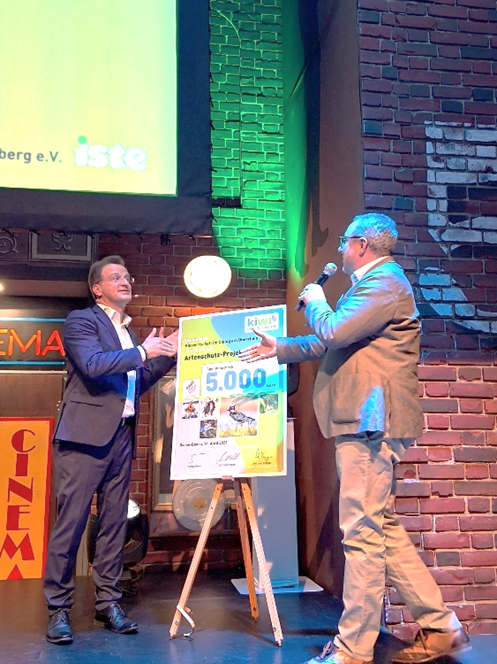 Ob Moorfrosch, Kiebitz oder Luchs – Professor Dr. Matthias Reinschmidt, Direktor des Zoo Karlsruhe, engagiert sich mit großem Einsatz für den Artenschutz. Im Rahmen zahlreicher Projekte gelingt es dem auch aus dem Fernsehen bekannten Zoologen immer wieder, bedrohte oder regional ausgestorbene Arten erfolgreich nachzuzüchten und auszuwildern. „200 Jahre war der Luchs aus unseren Breiten verschwunden, inzwischen ist er wieder da – das gibt Hoffnung“, betonte Reinschmidt in seinem Vortrag. Biodiversität sei kein „nice to have“, sondern eine zentrale Voraussetzung für unsere Zukunft. Sein Engagement reicht dabei weit über die Region hinaus: Mit der Artenschutzstiftung Zoo Karlsruhe unterstützt er auch internationale Projekte, etwa zum Erhalt der Artenvielfalt in Ecuador. Für den weiteren Einsatz zum Schutz heimischer Arten am Oberrhein – darunter Kiebitz und Großer Brachvogel – erhielt Reinschmidt einen Spendenscheck über 5.000 Euro für die Artenschutzstiftung des Zoos, überreicht von Thomas Peter im Namen des KiWi-Vorstands.